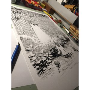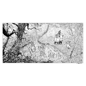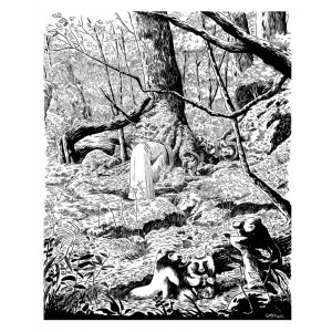 1 illustration en noir et blanc « Tanukis » en format A2 sur papier Olin blanc de 250 gr., numérotée et signée + 1 ticket de tombola