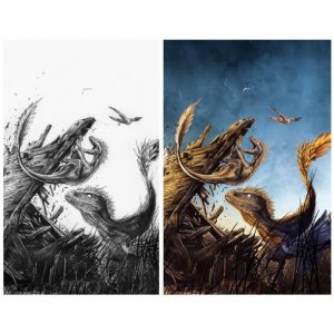 La totale : Le Pack "Quetzacoaltus" plus deux dessins originaux A3, à la fois de l'auteur et du coloriste, tous deux encrés et signés...